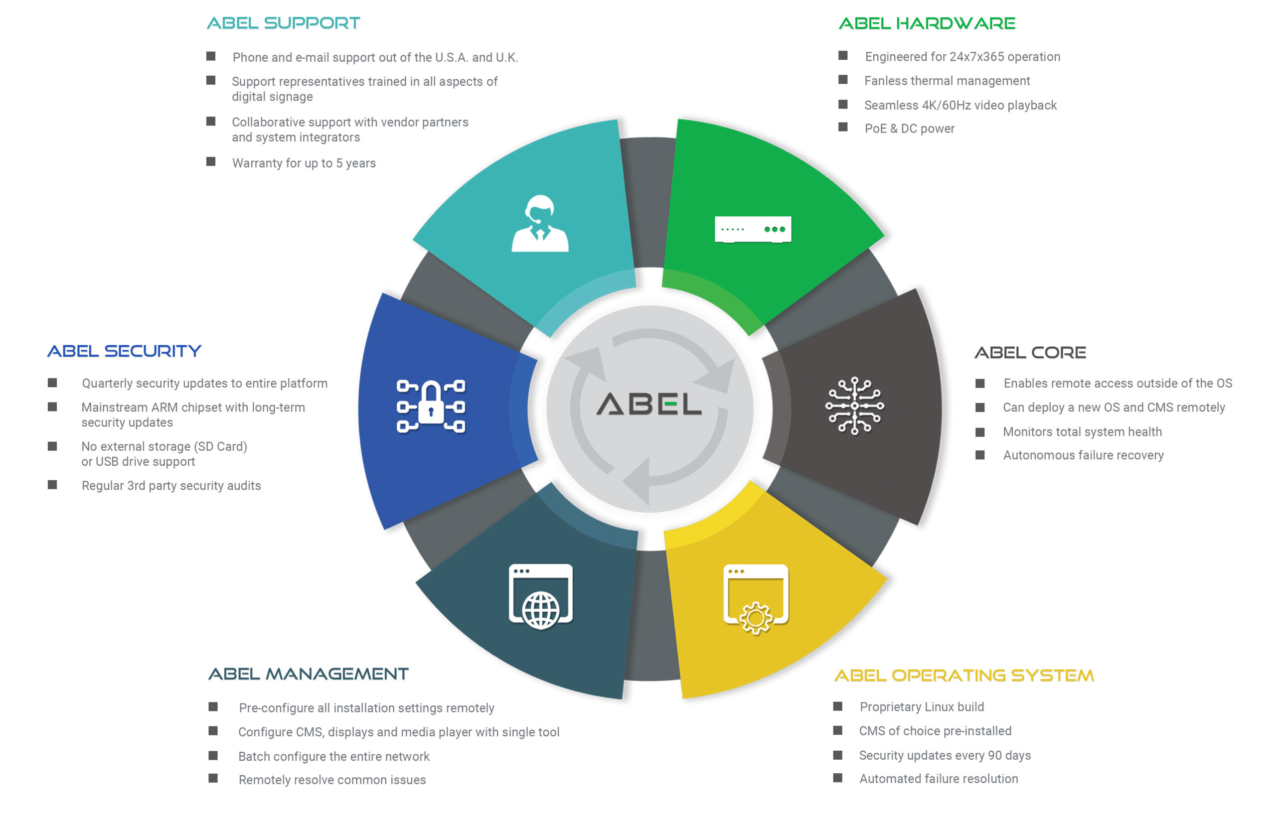 ABEL is a platform designed to simplify the procurement, deployment, management, and support of digital signage networks in a wide array of markets. ABEL is a simplified, single SKU solution that includes proprietary hardware and software, support, warranty, and a host of other features that can be purchased through a single, up-front payment or on an annual subscription basis.