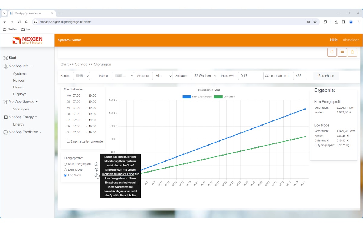 In the pilot operation, the supermarket chain was able to achieve energy cost savings of 30 percent – with comparable image quality. According to Nexgen, the food retailer saves over 75,000 euros per year for the pilot network of 750 screens – which corresponds to around 250 tons of CO2 annually.