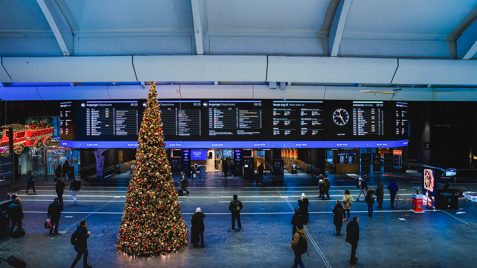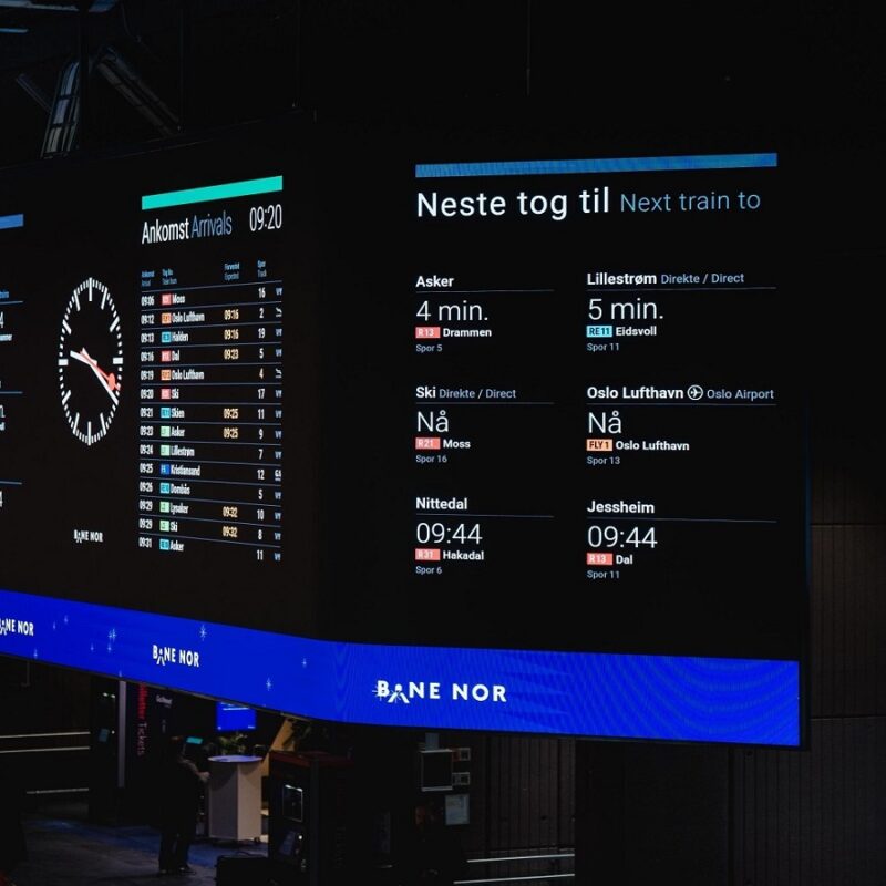 Oslo central station is Norway’s busiest railway hub, with more than 150,000 visitors every day. It already had a vast information display in the main hall, but it was beat-up and getting old, and losing its brightness.