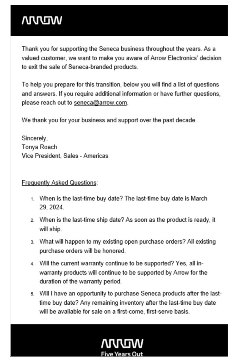 An Arrow VP sent around an email to customers Tuesday making them aware of the corporate decision to “exit the sale of Seneca-branded products.”