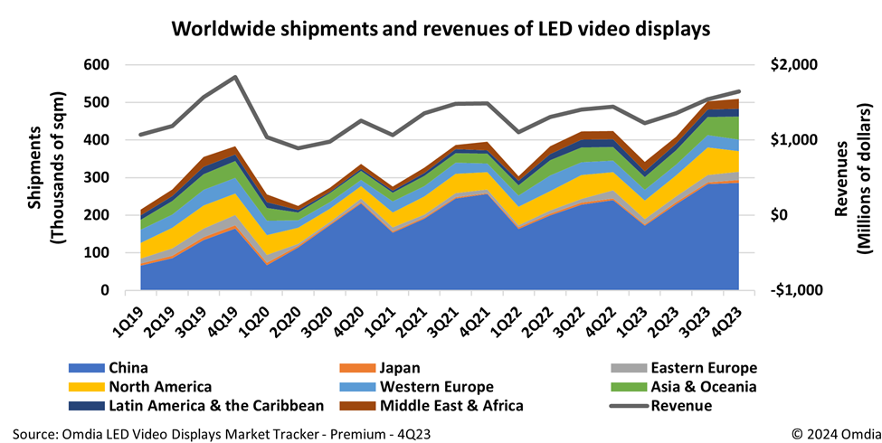 In 4Q23, shipments in the LED video display market grew by 1.3% compared to the previous quarter, while growing by 6.7% QoQ in terms of revenue. Tay Kim, Senior Principal Analyst from Omdia’s ProAV practice commented: “As global inflation impacts lessened in different regions toward the end of 2023 and during the onset of 2024, many end users and customers are choosing value-added products, even if the prices remain relatively high. This trend is facilitating the expansion of LED video displays occurring this quarter.”