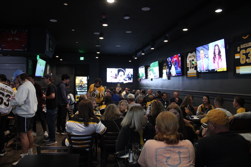 The screens range in dimension from 55 up to 98 inches, and are up there for diehard Bruins, Celtics, Sox and Patriots fans on game days.