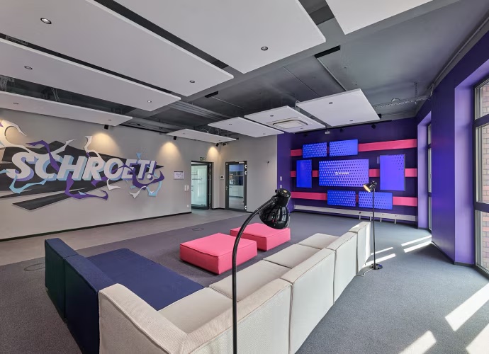This is the new Cologne, Germany headquarters building of the e-sports company SK Gaming GmbH, a three story space loaded up with Sony pro displays, including a big 12 sq. meter super-premium Crystal LED that appears to be ready for active gaming.