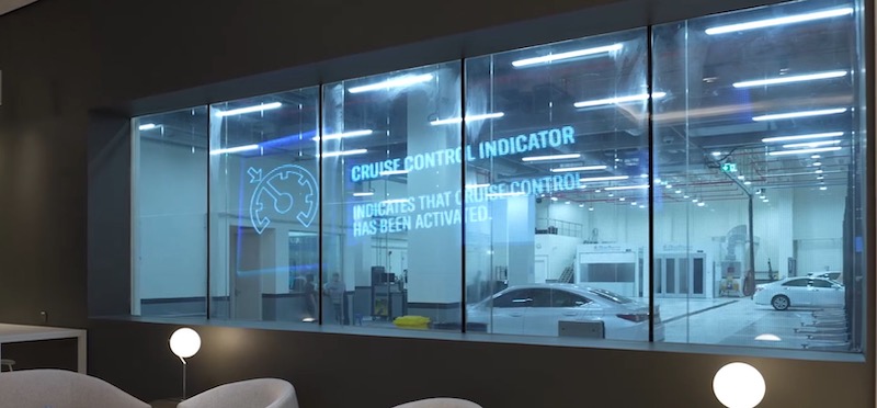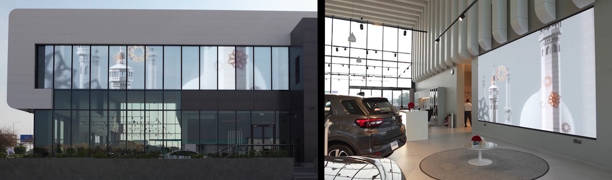What Instronic doesn’t tend to get into is the technical stuff, so I don’t really know what was used here for displays. The big one in the 14-panel window facing the street and another one looking into the service bays are both transparent, but I am not sure what kind of transparent. Foil? Film? Mesh? Embedded in glass? Dunno.
