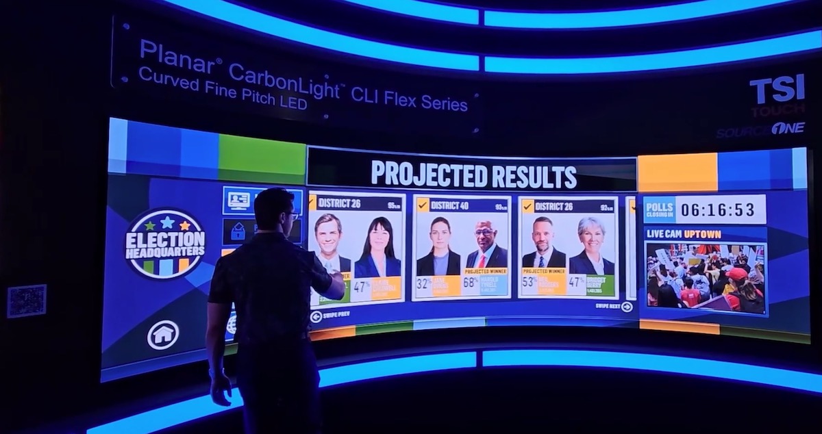 Here’s a video from the recent NAB broadcast tech show in Las Vegas, showing a curved 0.9mm pitch LED display made by Planar, equipped with IR touch from TSI Touch, that fully works on that curved surface. Each flexible LED module has a protective coating, and the flexible nature of the product allows for the curve.