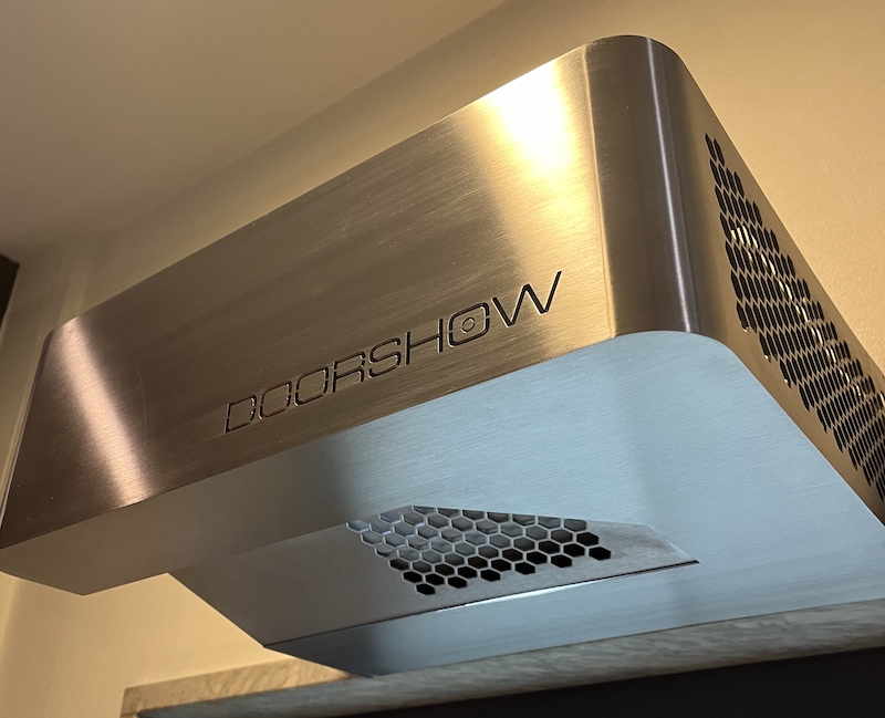 It is a short-throw projector mounted about the door to the hotel’s guest elevator, called Doorshow. The website is all in German but this is a product of Swiss elevator manufacturer Schindler, which has what it calls the Schindler Media Network. That network also includes large format displays inside elevator cabs, on a wall.