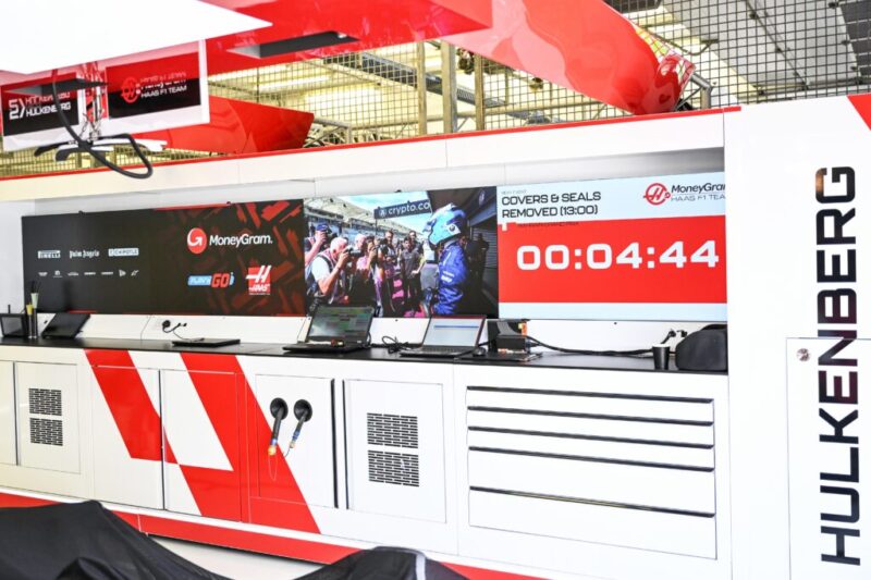 The Haas team ultimately commissioned Tateside in 2023 to bring new marketing visuals and live streaming data to the garage using digital signage. Tateside chose a connected ecosystem of Brightsign players that drive 55-inch LG video wall displays. The players synchronize and time the content on the displays, including sponsorship material, animations, live feeds and timing data.