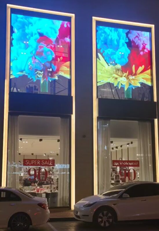 A home furnishings retailer in Dubai is using those semi-transparent, wafer-thin LED displays on the upper levels of its store.