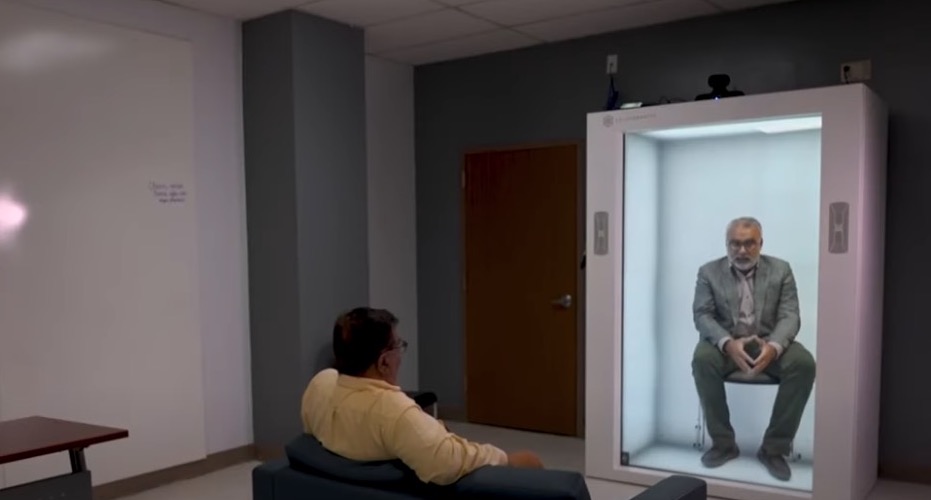 The core element of the program is a big transparent LCD set-up developed by the Dutch firm Holoconnects, which is what patients see. The news coverage is a bit unclear, but I think the studio end of this has the lighting and video capture set-up and a much, much smaller display showing the patient.