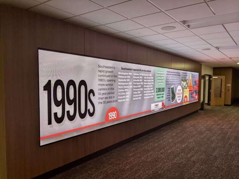 It could be argued that there’s maybe a bit too much information to take in with the company timelines, but this is a nice example of effectively using a big LED wall in a corporate lobby – the Lexington, SC corporate office of Southeastern Freight Lines.