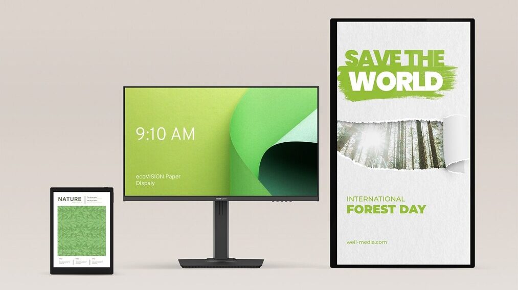 - a mobile sign designed for portable use cases, built around a 23.8-inch ecoVISION Paper Display, 9600mAh battery and an adjustable floor stand on wheels;