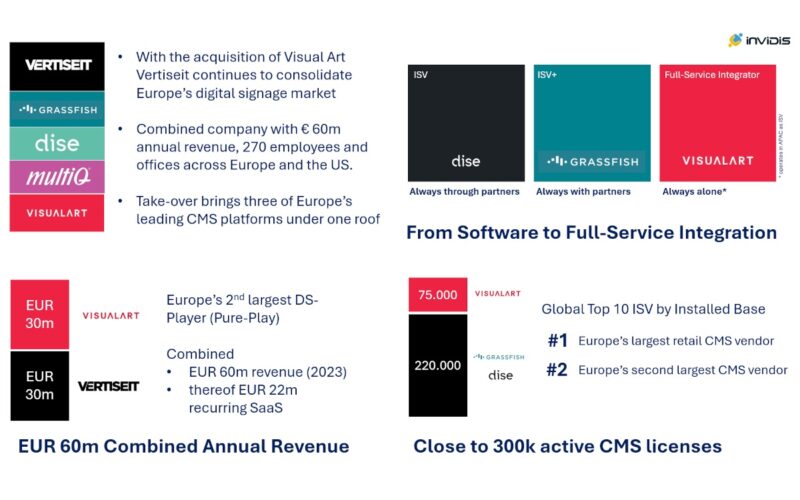 Vertiseit sees itself neither as an independent software provider (ISV) nor as an integrator. With Grassfish, Vertiseit is active on the market as a retail experience platform provider plus concept and integration (ISV+); independent digital signage integrators are supplied with the Dise software platform. With the takeover of Visual Art, Vertiseit is now expanding its offering to include a full-service integrator with a leading CMS platform, content studio and retail media business.