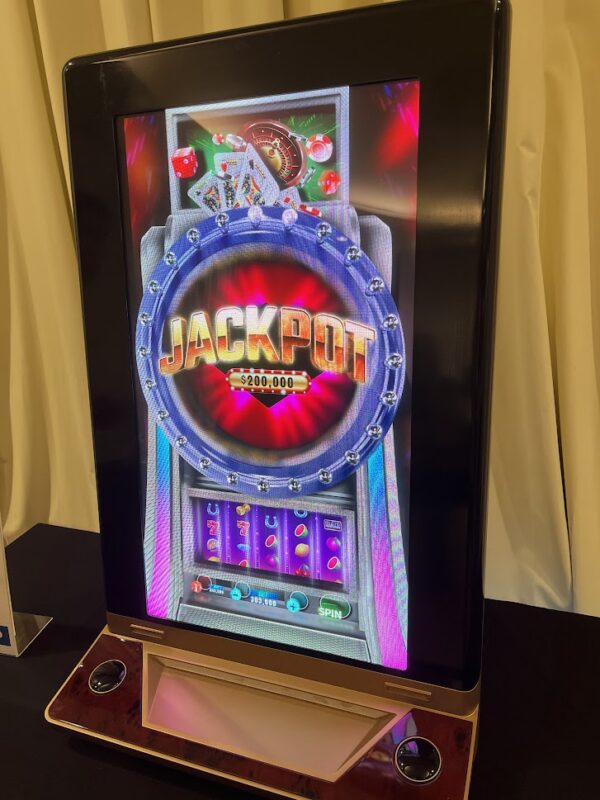 Here’s an interesting slot machine prototype that has a transparent microLED screen with a conventional LCD screen behind it, creating some depth. AUO provided a preview of this for me, as well some other interesting stuff using seriously transparent microLED screens.