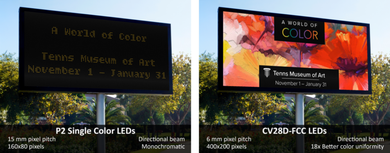Cree LED says its new CV28D LEDs with what it calls “FusionBeam Technology provides a big boost in resolution and image quality and better focuses light to reduce light trespass (pollution) by 4X over standard outdoor displays that use SMD LED packages.