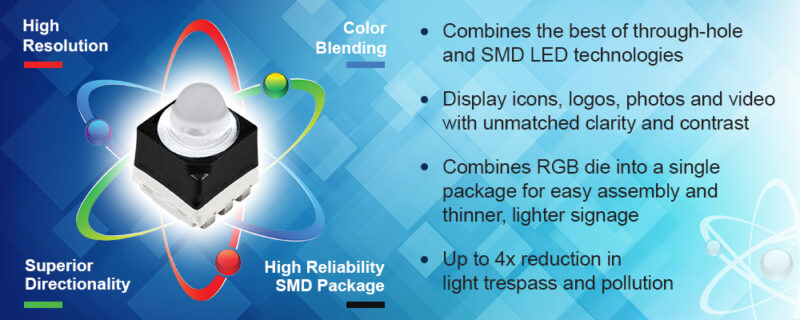 Compared to traditional through-hole LEDs, the CV28D enables displays with 2.5 times the resolution, equivalent to the leap from standard definition 480p to full HD 1080p video. At the heart of the CV28D’s performance, FusionBeam Technology simultaneously blends individual RGB LED dies into a single, uniform color and then sends it only to the intended audience. The new LEDs also feature advanced directionality, focusing light on the intended viewer while reducing light trespass and pollution to four times less than standard RGB SMD LEDs.
