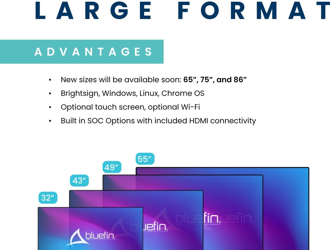 While Bluefin is based in Atlanta, it has a factory in Shenzhen assembling and shipping smaller displays. Adding larger formats would very likely represent a partnership with one of the big flat panel manufacturers like TCL, which has a commercial LCD business unit called Moka and already has displays embedded with BrightSign player boards.