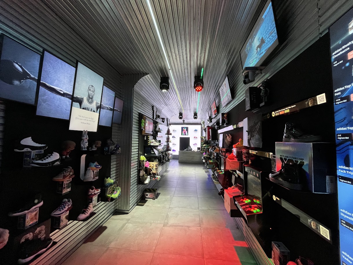 This, below, is the sneaker store he has built in a space just steps way from the main Admira office. It is not open to the public, and you would not even know it is there, as it has a roll-up, roll-down metal door at the front. If I am remembering correctly, much of the stock in the “store” involves shoes Santin has bought through the years.