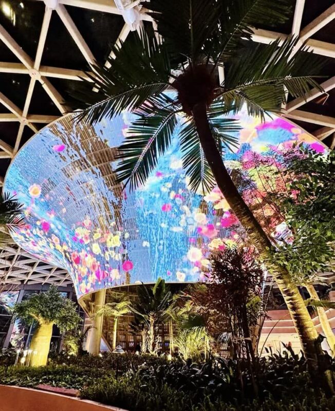 It is in the common area of the mall and appears to be a waterfall-like tower made using mesh LED.