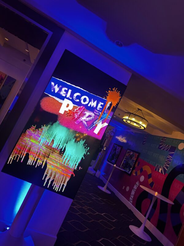 - A 30-foot wide LED wall on the presentation stage displayed digital portrait content that became animated with splatter paint effects and over 45 custom portrait animations.