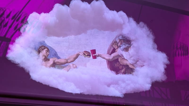 The Grand Ballroom was also a canvas for projection-mapped artwork, where portraits came to life … like historical figures holding lollipops or reaching between frames to interact with other portraits. Even the ceiling had animated content inspired by the Sistine Chapel, but with a cheeky twist.