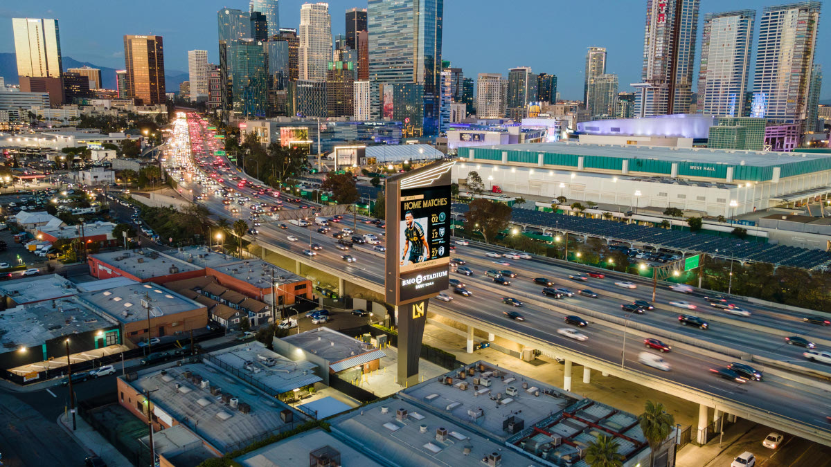 One pylon stands just east of BMO Stadium on the northbound side of I-110, while the other is positioned near the I-110/I-10 interchange, two of the city’s busiest freeways. Each structure features three seamlessly connected faces – two main 15-meter x 13-meter (50-foot x 42-foot) screens and a three-meter-wide (nine foot) spine – creating a total digital canvas of approximately 873 square meters (9,400 square feet) and over 8.7 million pixels.