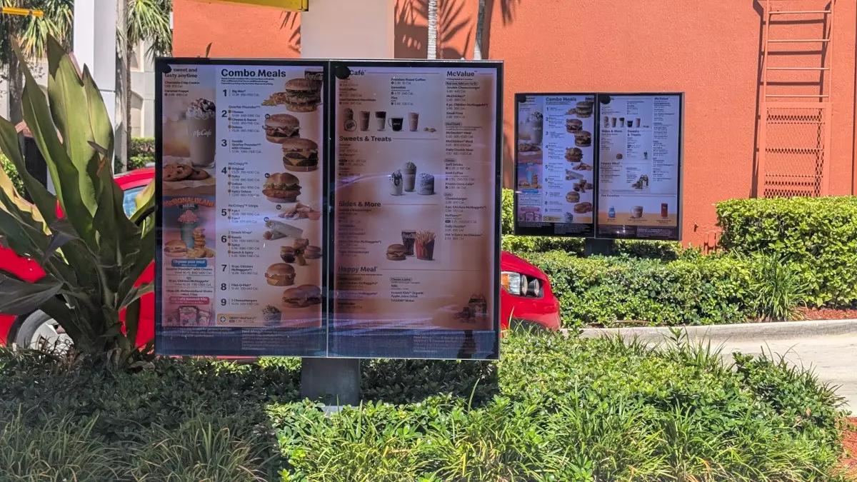 Heat-damaged screens are a common sight in drive-thru lanes at QSR restaurants. Many digital signage displays are installed without adequate protection from direct sunlight or proper thermal management. As a result, temperatures between the protective glass and the display panel can soar above 80°C (176°F). Prolonged exposure to such heat gradually degrades the LCD crystals, leading to visible damage. In severe cases, screens develop brown spots resembling measles; more often, they show widespread brown discoloration that, while less dramatic, still significantly compromises image quality.