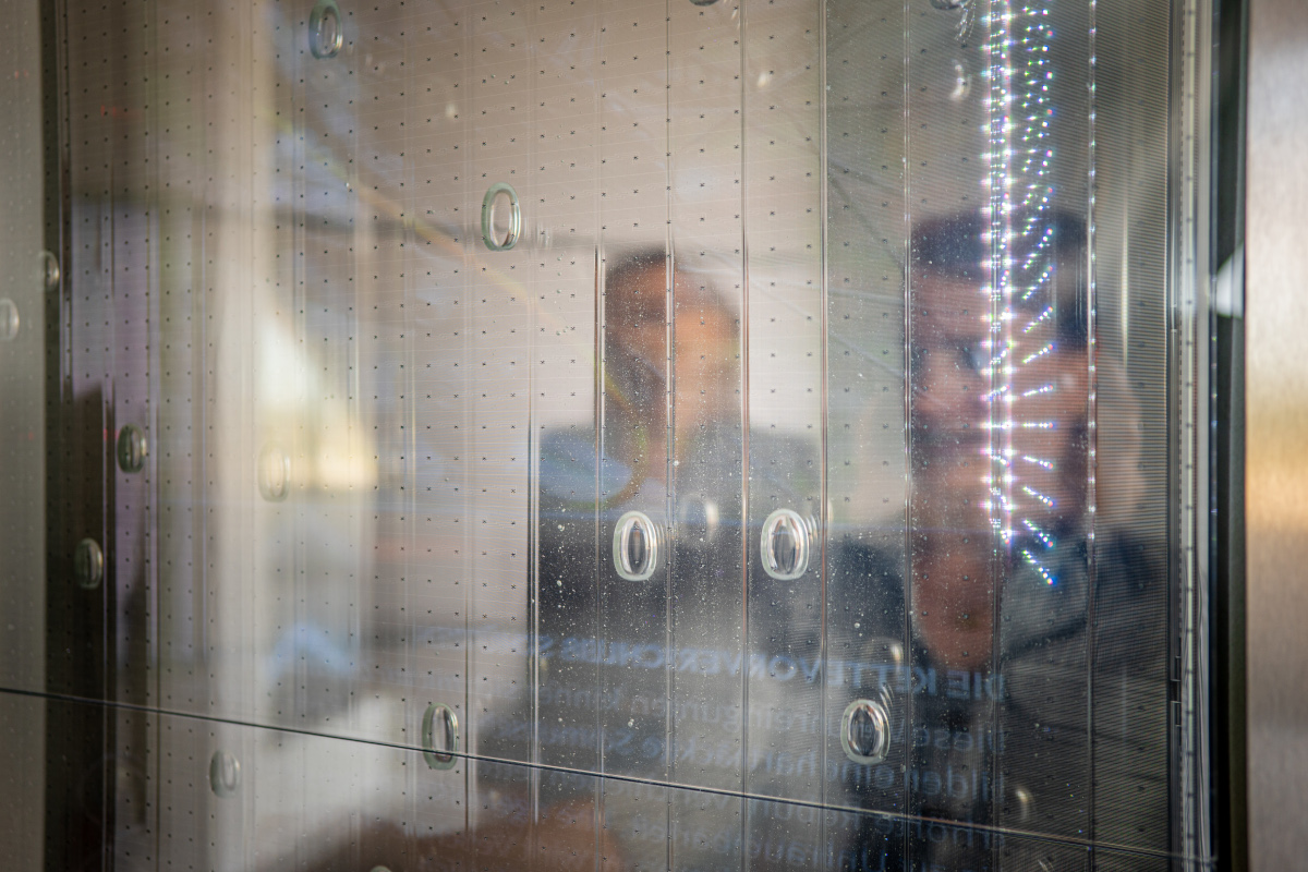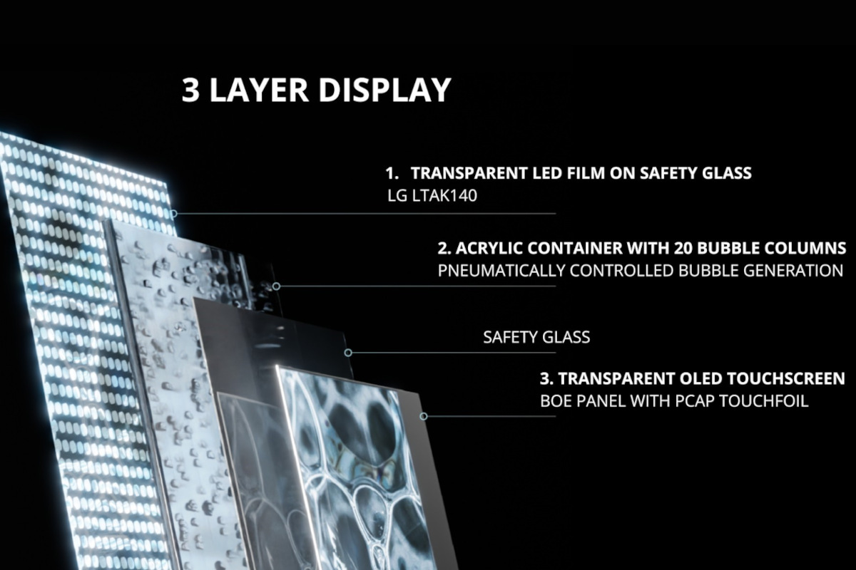 The acrylic glass layers include pneumatic valves that inject air bubbles into the glycerin, forming simple shapes or even letters. When active, the LED film projects color and information onto this bubble surface, while staying mostly transparent when it’s off. The top layer – a multitouch OLED screen – lets visitors interact directly with the installation.
