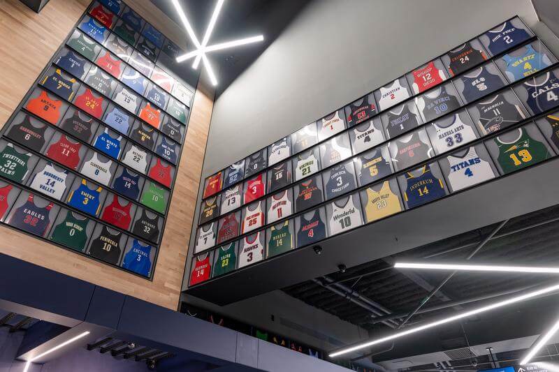 Dimensional Innovations provided strategic planning, branding, and multiple technology integrations across the venue. Among the centerpiece features is a two-story high school jersey wall that honors California’s basketball legacy. The installation is powered by a custom application designed to showcase iconic players and connect fans to the state’s grassroots history of the game.